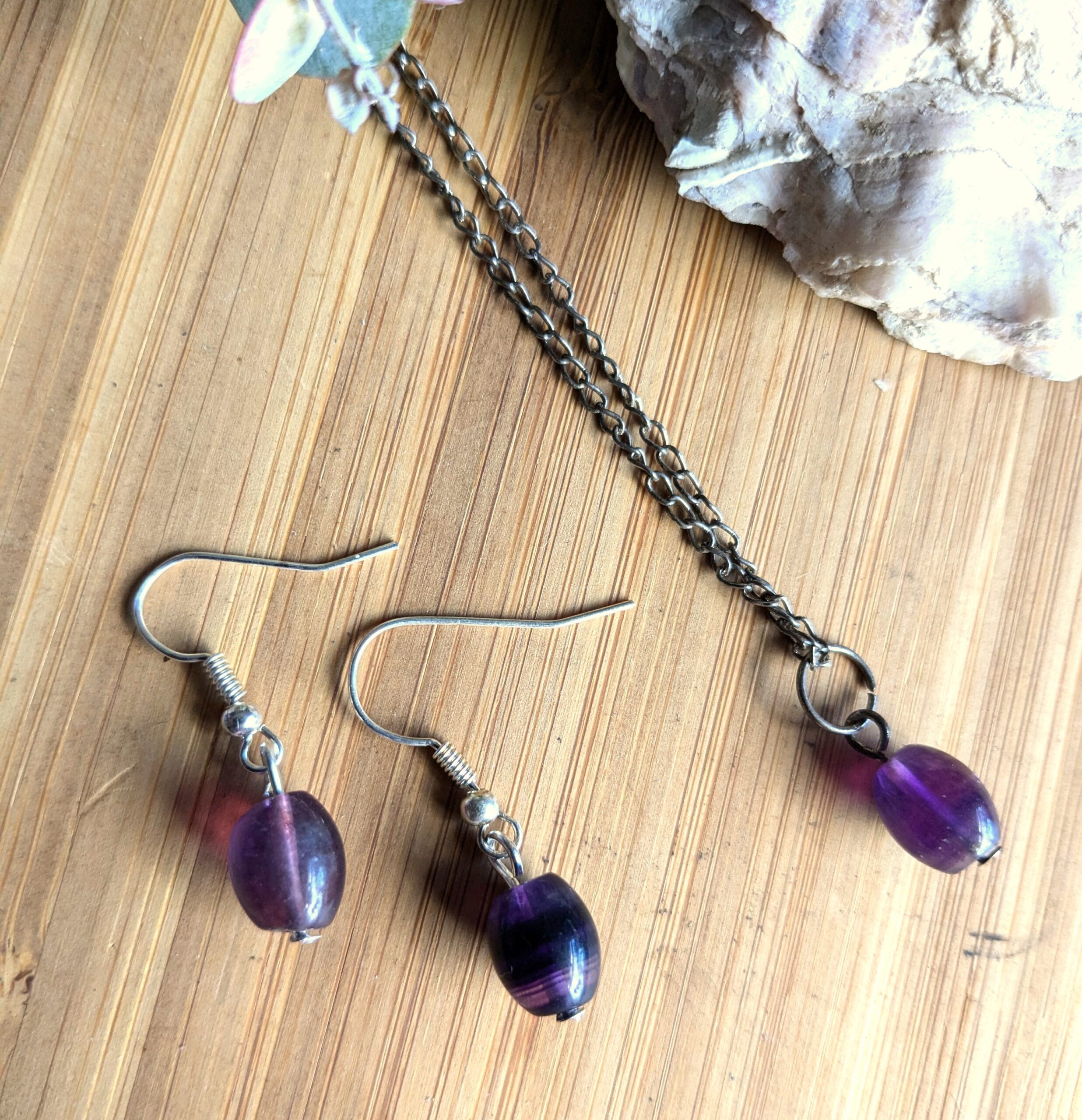 A lightweight vintage Silver coloured Nickel free chain with small oval Amethyst pendant with matching Earrings