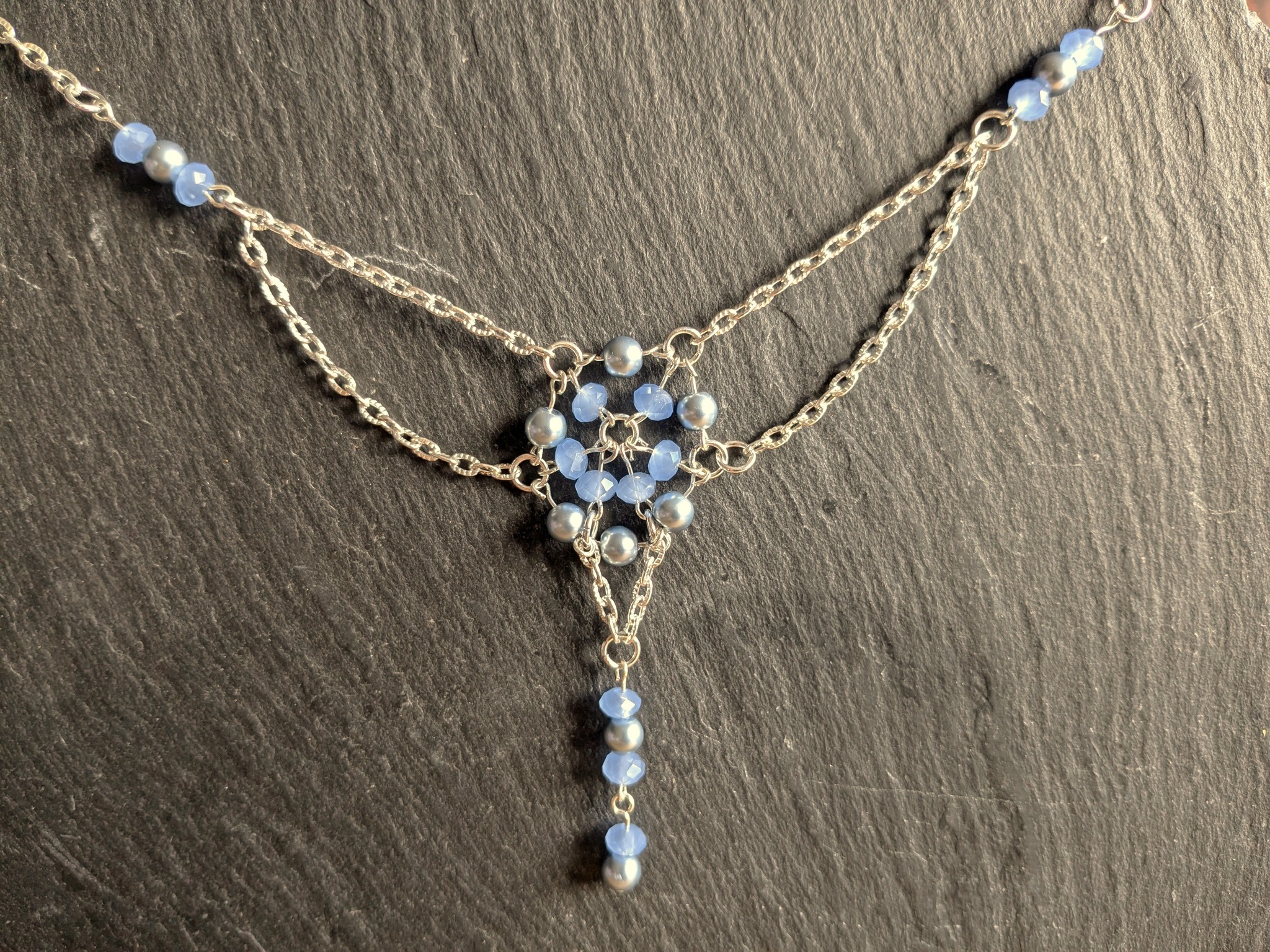 Beautiful chain & Beaded design with a vintage look. Opal Ice crystals & Glass pearls matched with oval silver chain finished with a lobster clas