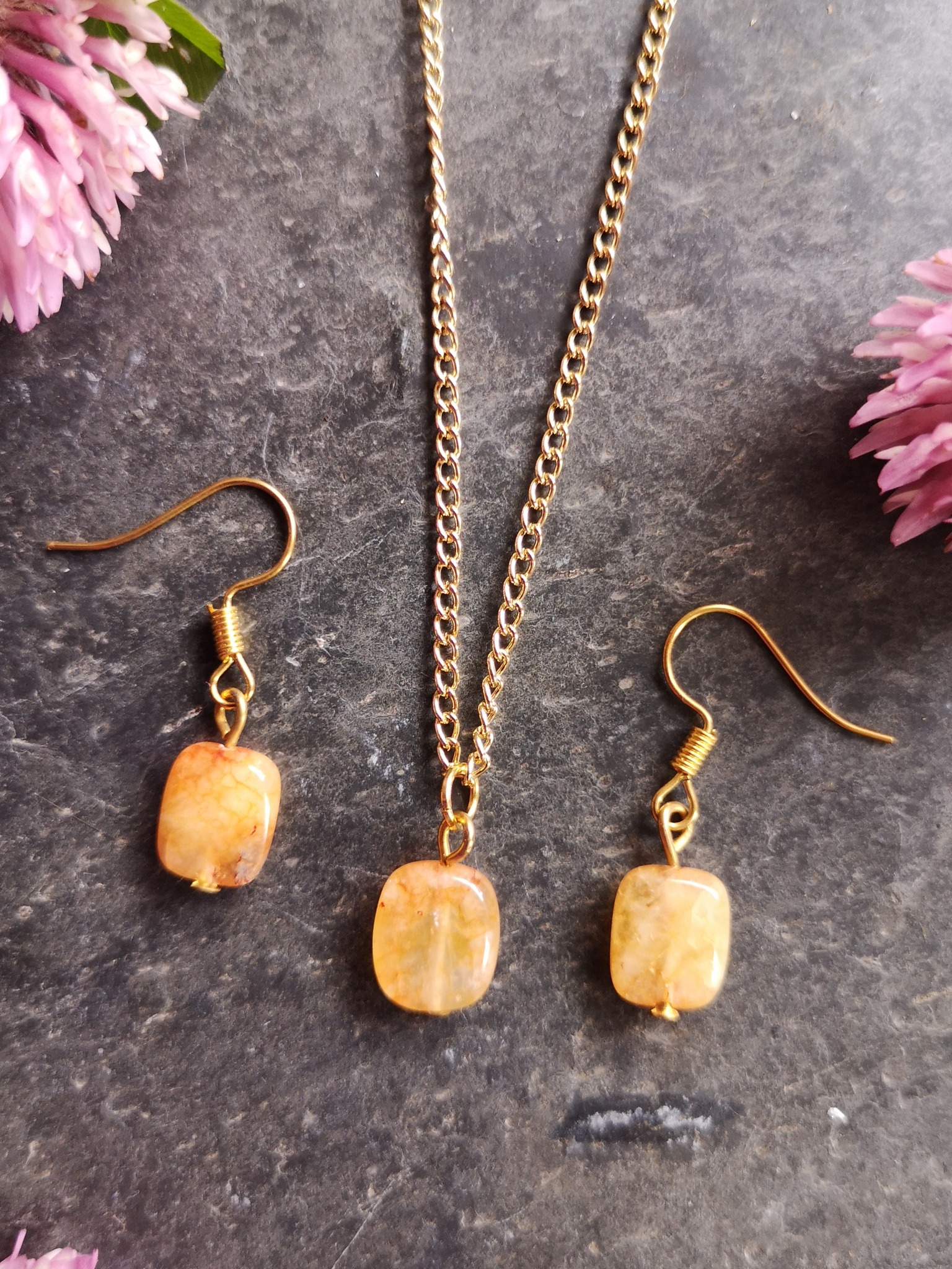 A lightweight Gold coloured Nickel free chain with small Sunstone pendant with matching Earrings